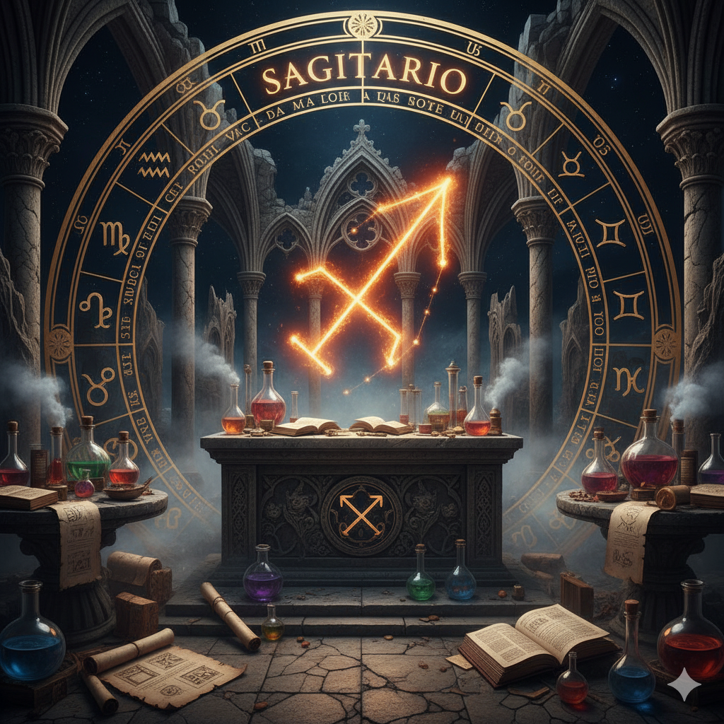 • Símbolo de Sagitario (♐︎): El glifo central es la Flecha del Arquero. Sagitario es un signo mutable de Fuego, regido por el expansivo planeta Júpiter. Representa la aspiración superior, la filosofía, la gnosis (conocimiento revelado) y los viajes hacia lo trascendente. Su arquetipo, el Centauro, simboliza la integración de la naturaleza instintiva y animal (el caballo) con la conciencia superior humana y espiritual (el torso y el arco), que ahora apunta directamente hacia los cielos, hacia un objetivo divino.