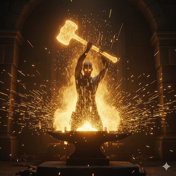 Tu libre albedrío es el Fuego, el Martillo y el Yunque. Es tu capacidad de encender la llama de la voluntad, de calentar el mineral hasta hacerlo maleable. Es cada decisión que tomas, cada golpe del martillo que da forma al metal. Es la resistencia del yunque de la realidad sobre el que trabajas.